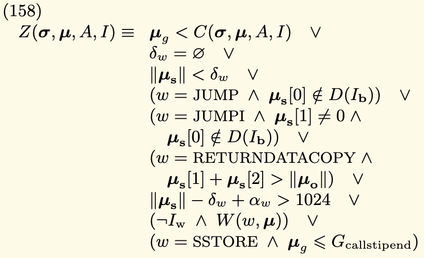 Importantly, to maintain eyeball closeness to the Yellow Paper, we also re-use the function names therein in our formalization. For example, the Z function, defined in equation (158) of the Yellow Paper, which handles exceptional halting, is defined in the Yellow Paper as follows:
