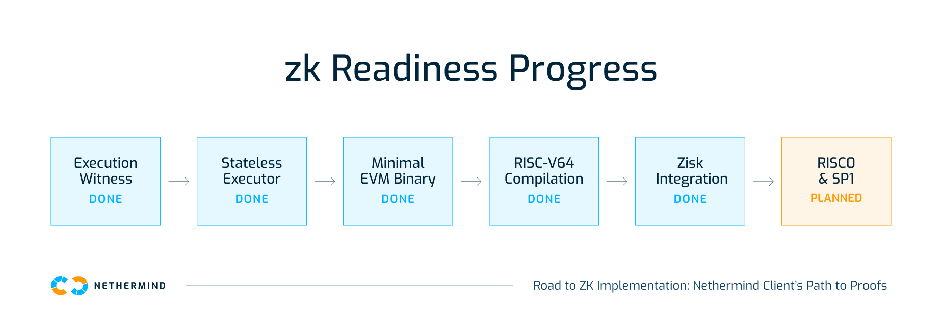 Nethermind’s current readiness at the time of publishing is best described as foundational work completed, final proving steps underway. Much of the engineering groundwork is done, and what remains are focused milestones to reach end-to-end proof generation.