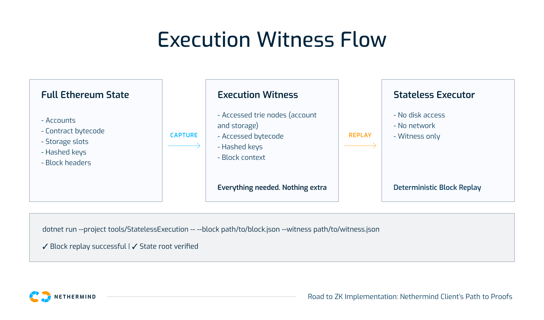 Constraints: At this stage, the witness and the executor are aimed at controlled replay and testing, not production workloads, but it demonstrates that stateless execution is possible today.