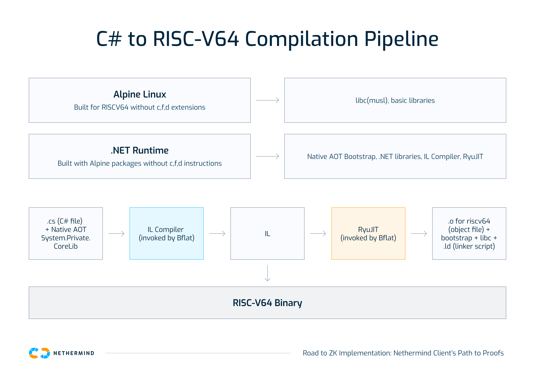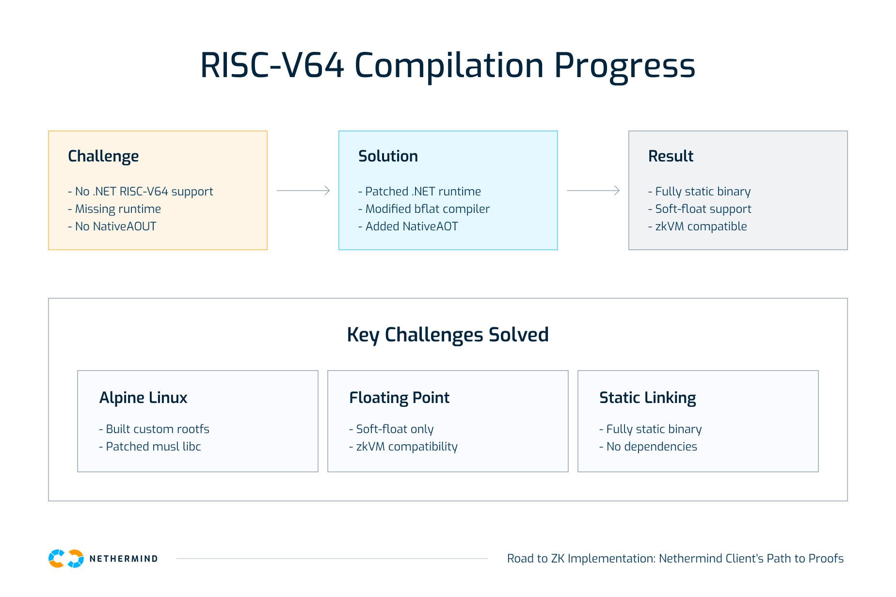 To make Nethermind Client compatible with zkVM targets, we compiled it to RISC-V64. This was not straightforward: when we started, .NET did not fully support RISC-V64, so our team had to apply a series of fixes to both .NET and the custom C# compiler.