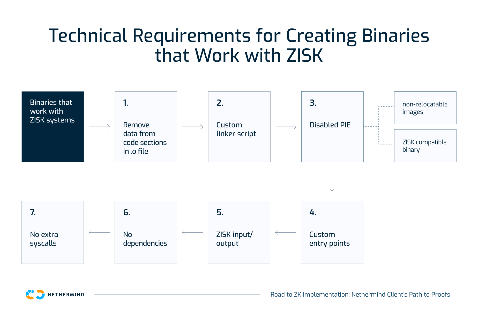The next step is integrating Nethermind's minimal binary with Zisk, a zkVM environment built on RISC-V64. Zisk comes with its own input/output interface and requires custom linker scripts, so part of the work is making sure those scripts cooperate cleanly with both libc and Zisk's entrypoints and memory layout.