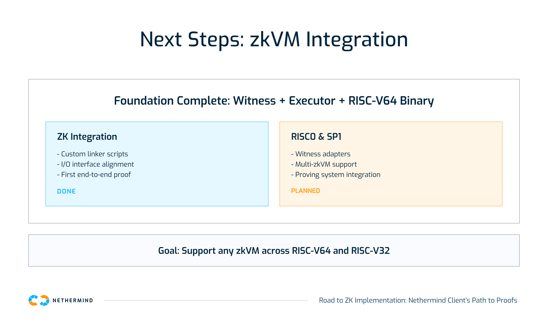 A key next step is integration with RISC0 and SP1, two widely used zkVMs. This work will focus on building adapters so that Nethermind’s witness and executor output can connect cleanly with their proving systems.